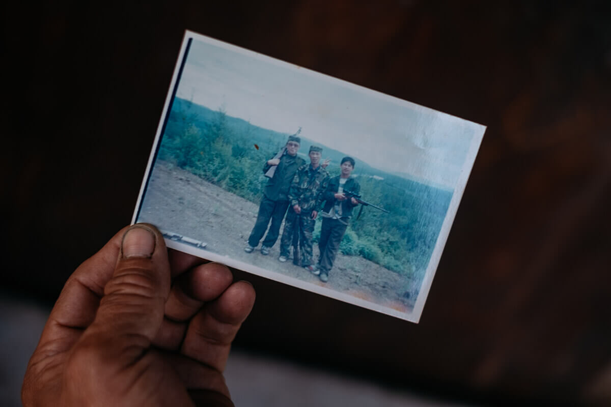 He Xie holds a photograph of himself and two friends at the former reindeer herding camp in Old Aoluguya.