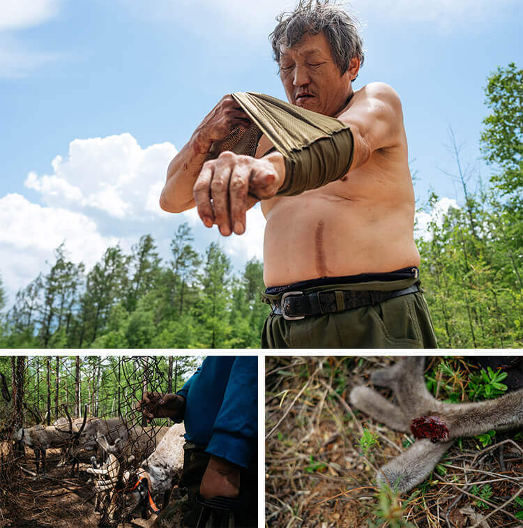 He Xie is one of the Evenki community’s most esteemed reindeer herders, and he’s about to cut off a reindeer’s antlers. Velvet antler — the stage before the protrusions calcify into bone — fetches high prices in the field of Chinese medicine, as it is thought to enhance male virility.