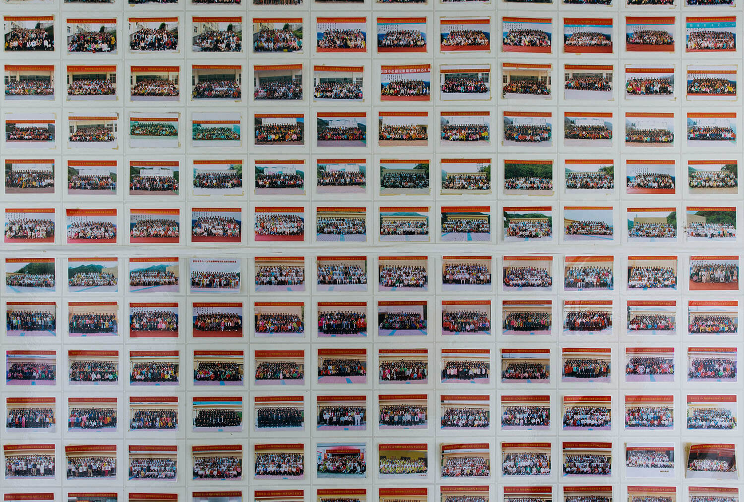 Class photos hang at a pedicurist training center in Ziyang County, Nov. 13, 2017.